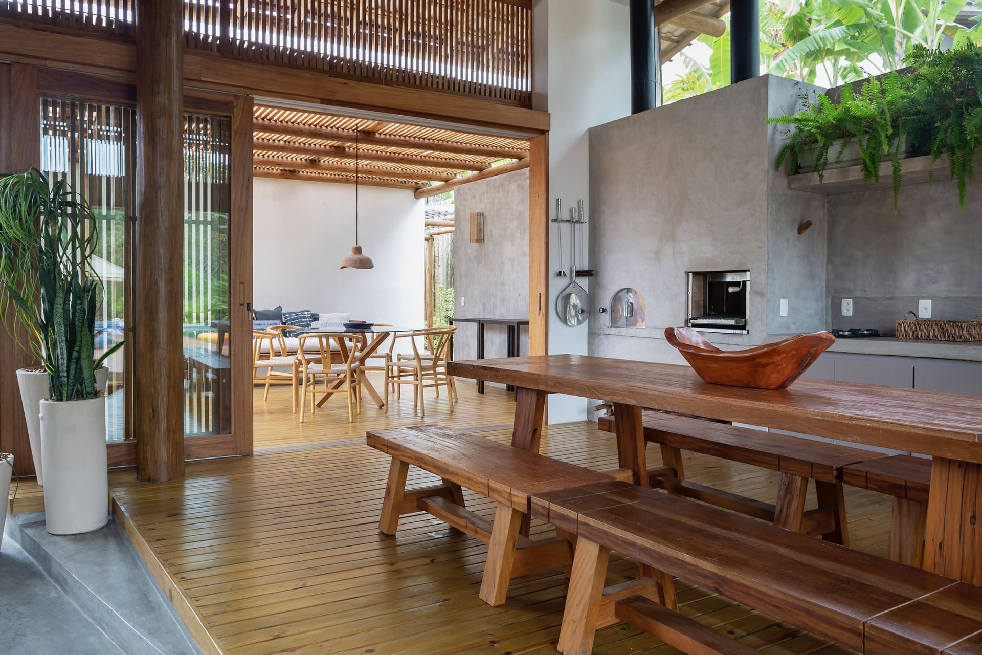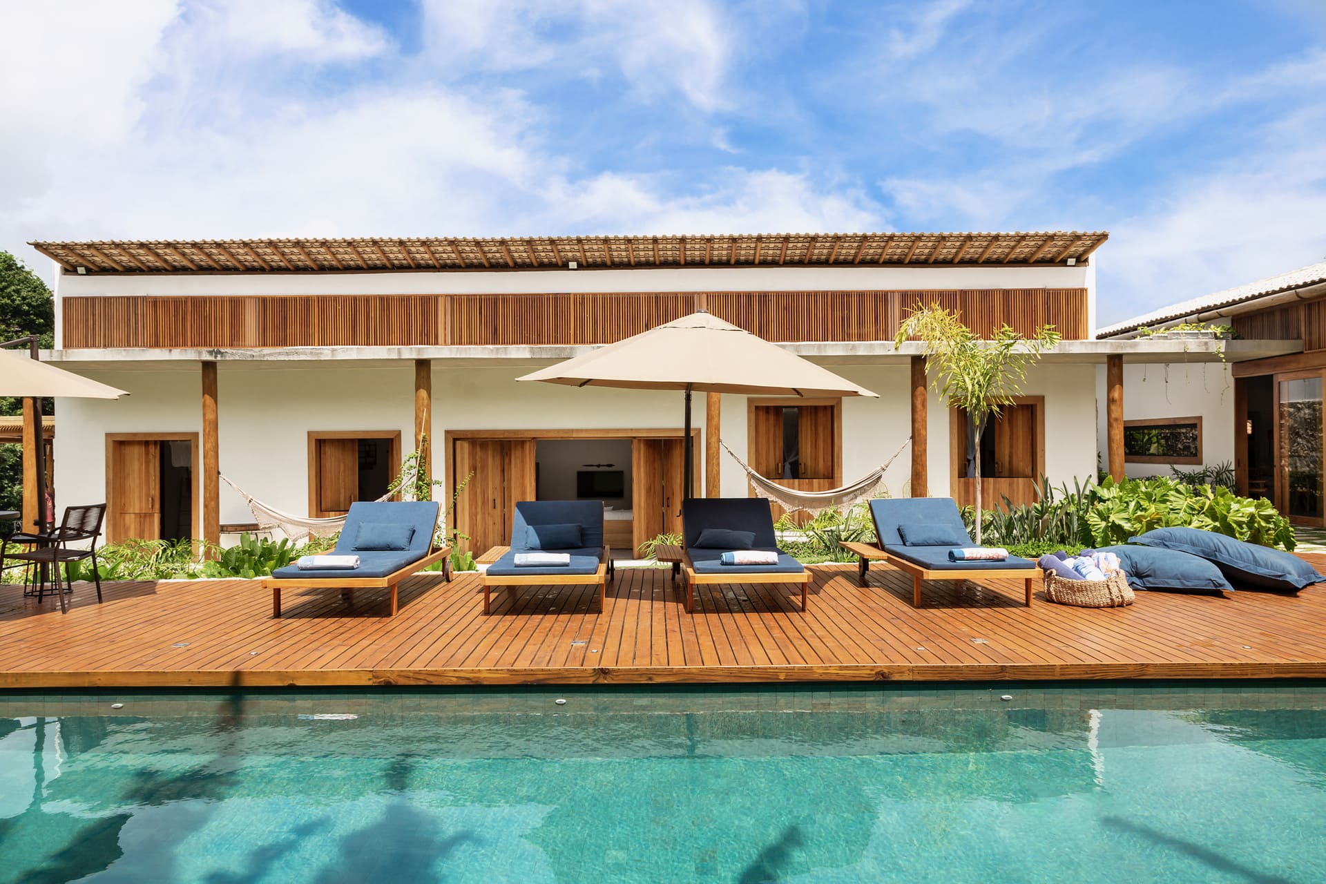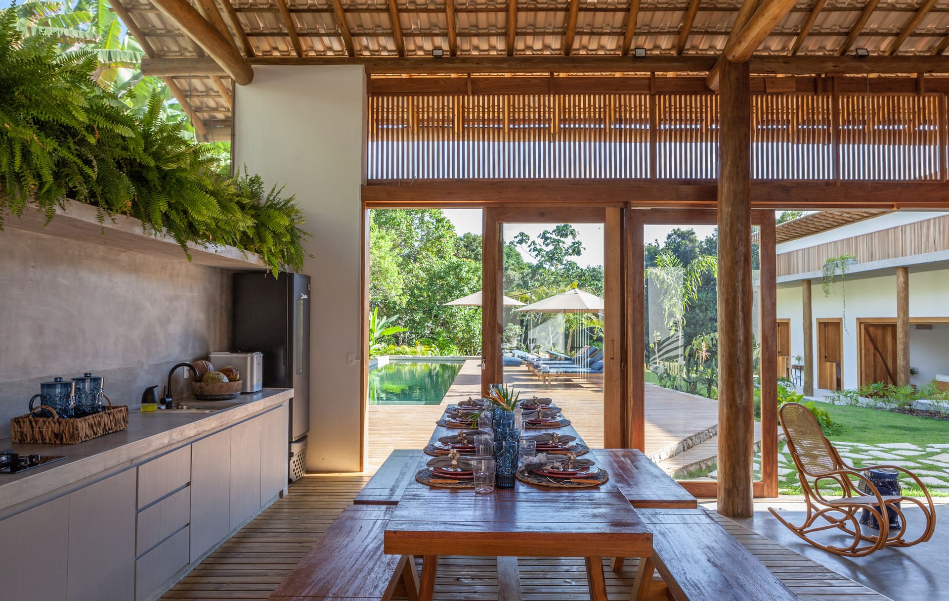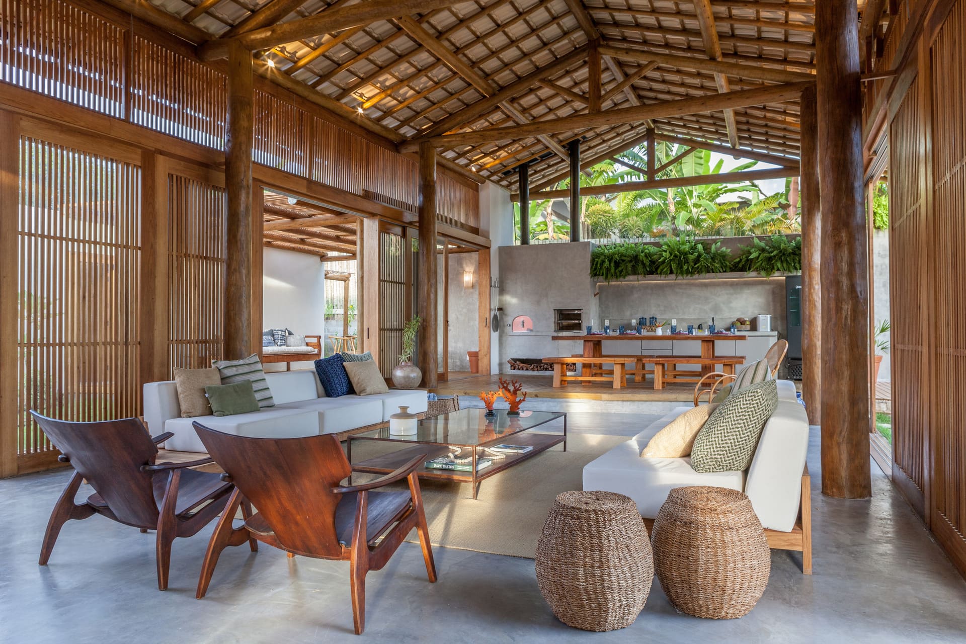 Casa Ipê showcases modern architecture that highlights the beauty of the surrounding nature. The beautifully decorated and spacious interiors feature locally crafted furnishings that not only tell a story but also add a rustic coastal charm to the home. The main living area includes a vast open-plan living room, a dining room for 12 people, a fully equipped kitchen, and a gourmet space with a barbecue, beer cooler, and a wood-fired pizza oven. The six suites each have private entrances and outdoor showers, allowing guests to take in the best views of the Bahian sky. One of the suites also features a private hot tub overlooking the forest. Inside, there is a cozy TV room, while the outdoor area—immersed in a lush garden integrated with native vegetation—boasts a swimming pool with a hydro-massage system, a steam sauna, and extremely comfortable loungers for complete relaxation. To top it off, the house also includes a wine cellar, an ice maker, and a support room.