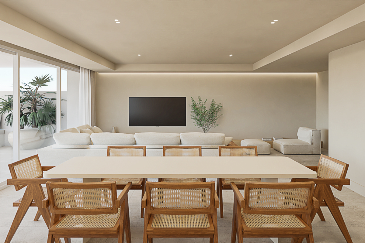 Casa Luma is located in the exclusive La Joya urbanization, just a few meters from the idyllic beaches of Cala Llenya and Cala Nova, and a short drive from San Carlos (less than 5 minutes) and Santa Eulalia (10 minutes). The project has been conceived to offer a resort-like lifestyle, with high-level common areas that invite relaxation and leisure. A spectacular tiered communal pool stands out, integrating with the topography of the terrain, surrounded by a lush 4,000 m² tropical and Mediterranean garden. The views from these common areas are simply breathtaking. For those who value well-being, the urbanization also includes a gymnasium for the exclusive use of residents.
