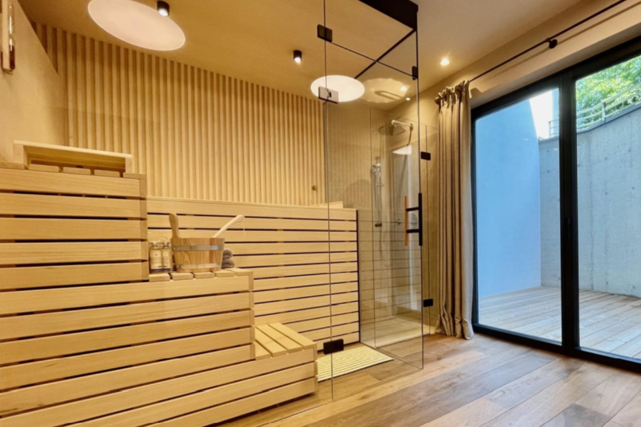 Large, floor-to-ceiling French doors seamlessly connect the living and dining area with the sunny east-facing terrace and open up a fantastic view of the Wilder Kaiser mountain range. In the basement, there is another bedroom with its own bathroom and an exclusive wellness area with a sauna.
