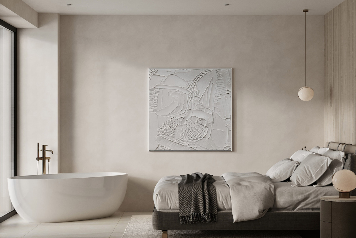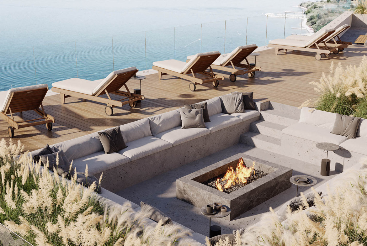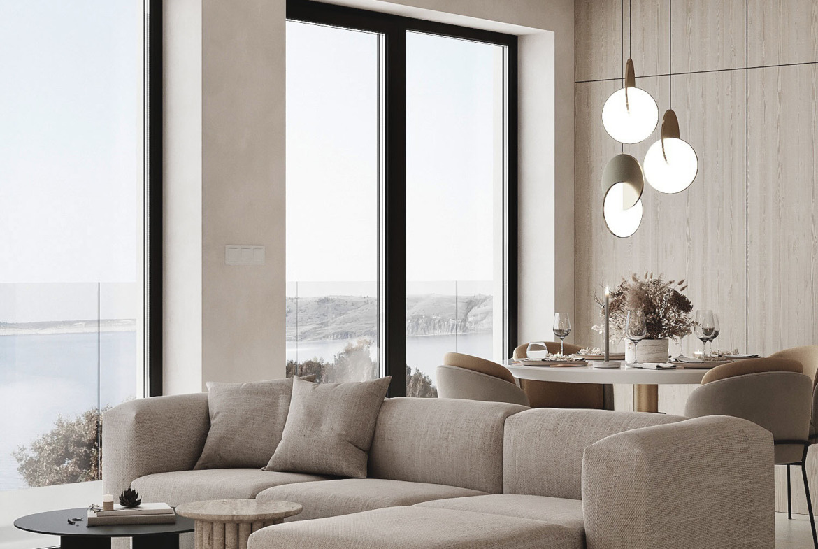 After entering your suite on the second storey and passing the entrance hall with the luxurious lavatory the sparkling, spacious, and light-filled living room area opens. With its wooden floors and marble cladding, this bright room features a comfortable sofa, a vast dining table, and a sleek kitchen island. The light furnishings, along with huge floor-to-ceiling French windows, let in a tremendous amount of sunlight, which is reflected in the elegant decorations. The adjoining guest room and a separate corner master bedroom feature a private walk-in closet and a soft double bed. The French window spreading over 2 walls allows you to enjoy the stunning bay view and the 42 m2 private terrace nicely frames the entire apartment.