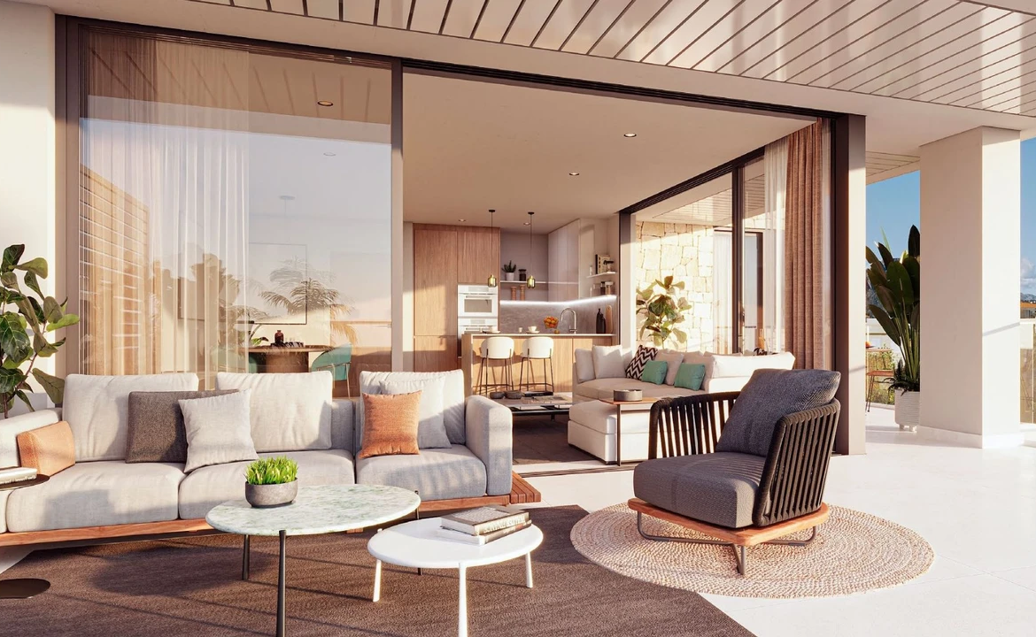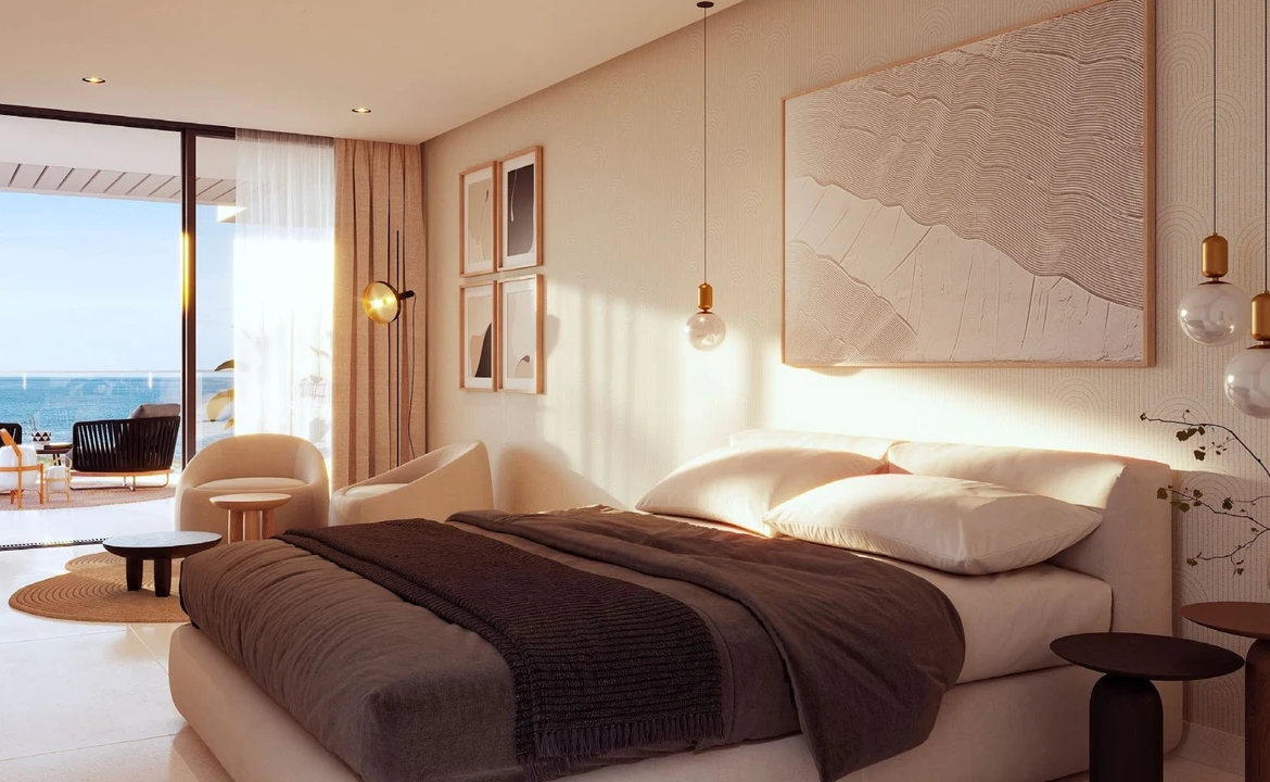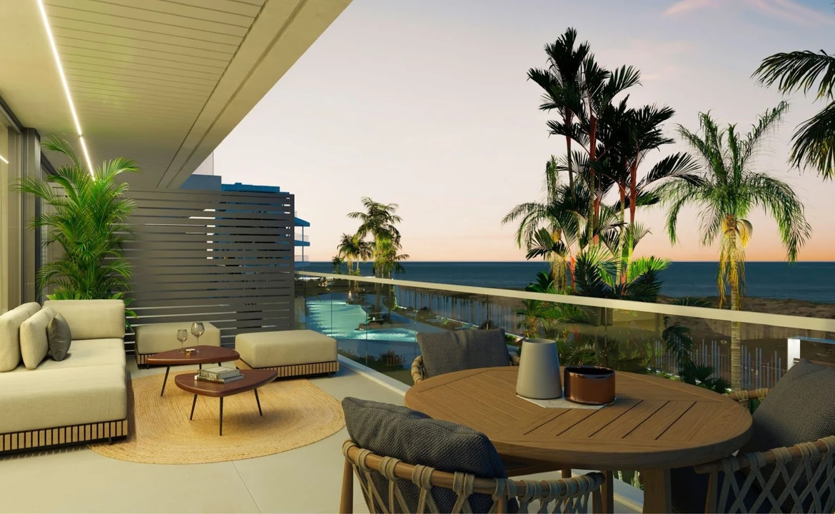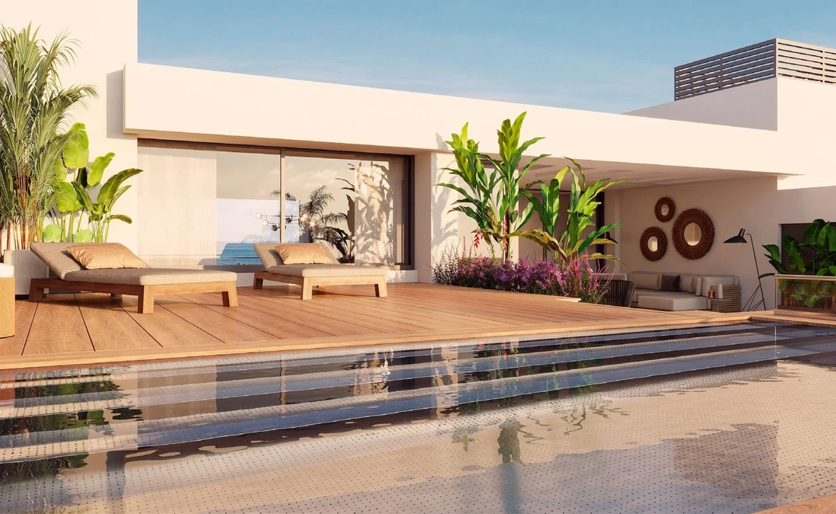 Modern new-build terrace apartment in prime first sea line with panoramic sea views, sunny terrace, pool, garden and direct access to the beach.