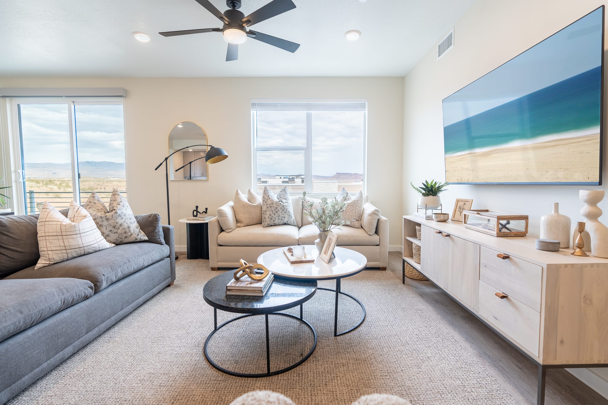 Exquisitely furnished, the Desert Promenade is an end-unit condominium with daylight windows on three sides. Featuring a spacious open concept for dining and relaxing, it has 3 bedrooms, 2 baths, and sleeps 8. Enjoy stunning panoramic sunset from any of three rooftop sky decks with hot tub, BBQ, fire tables, and comfortable seating.