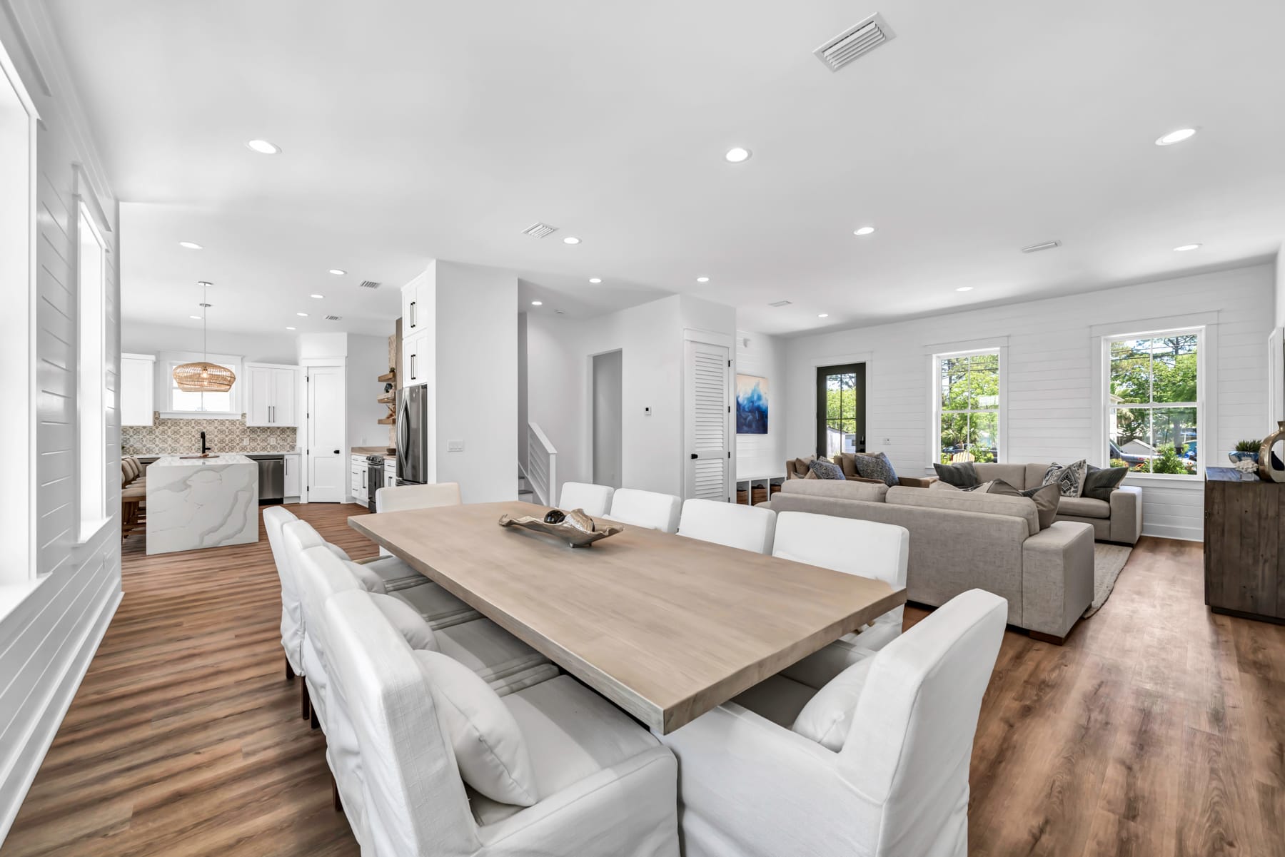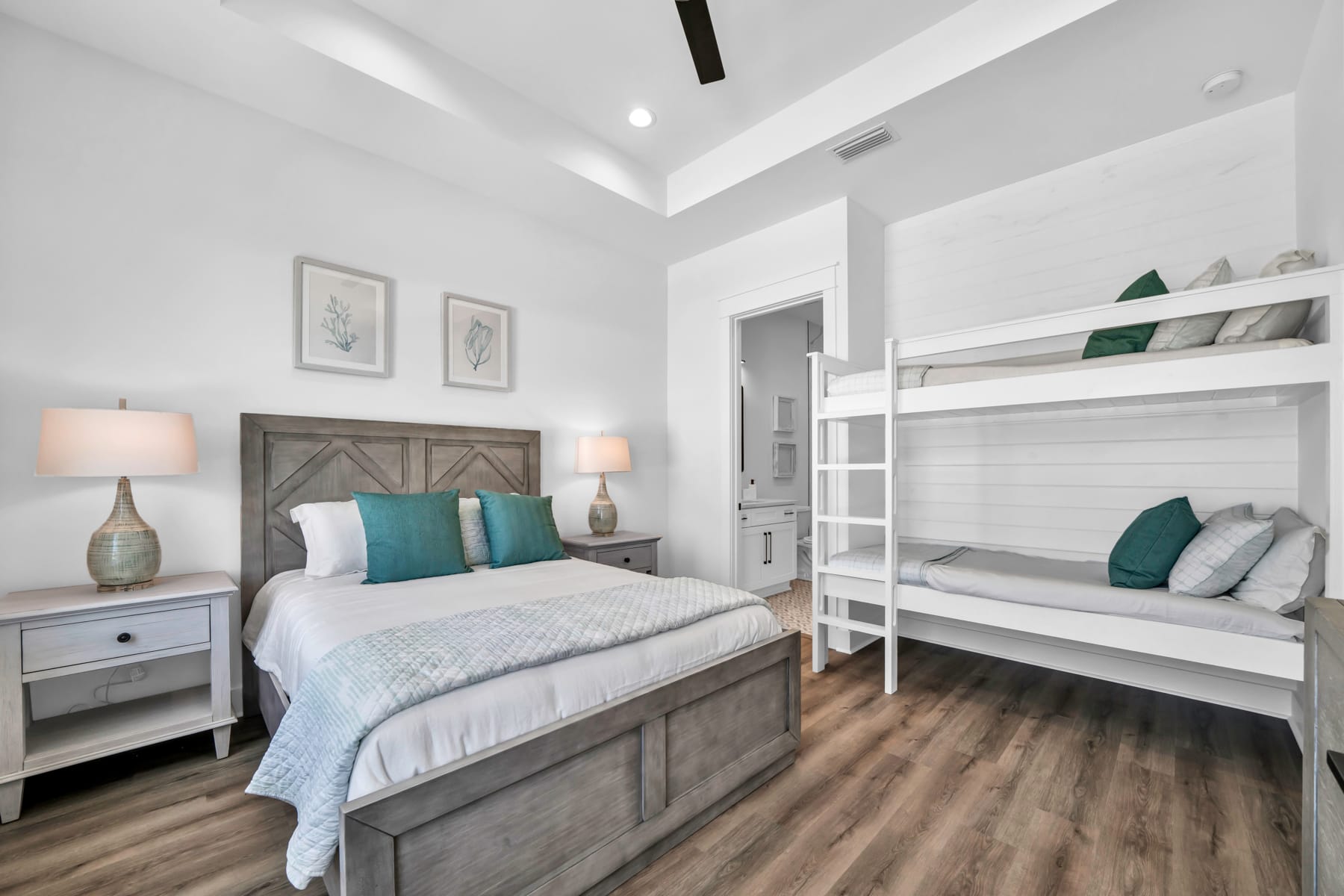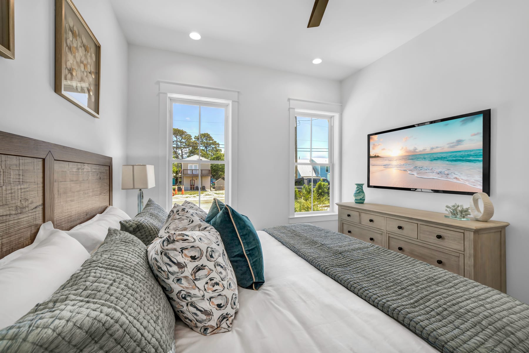 Inside, the home dazzles with a professionally designed interior to the Ember standard that showcases an effortless blend of elegance and comfort. The residence boasts top-notch finishes including stunning walk-in showers, sleek shiplap walls, and modern sliding barn doors. It comfortably sleeps up to 14 guests in its thoughtfully arranged spaces, which include four king bedrooms with en-suite baths, additional guest quarters with a queen bed and twin bunks, and a queen-size sleeper sofa in the expansive living area.