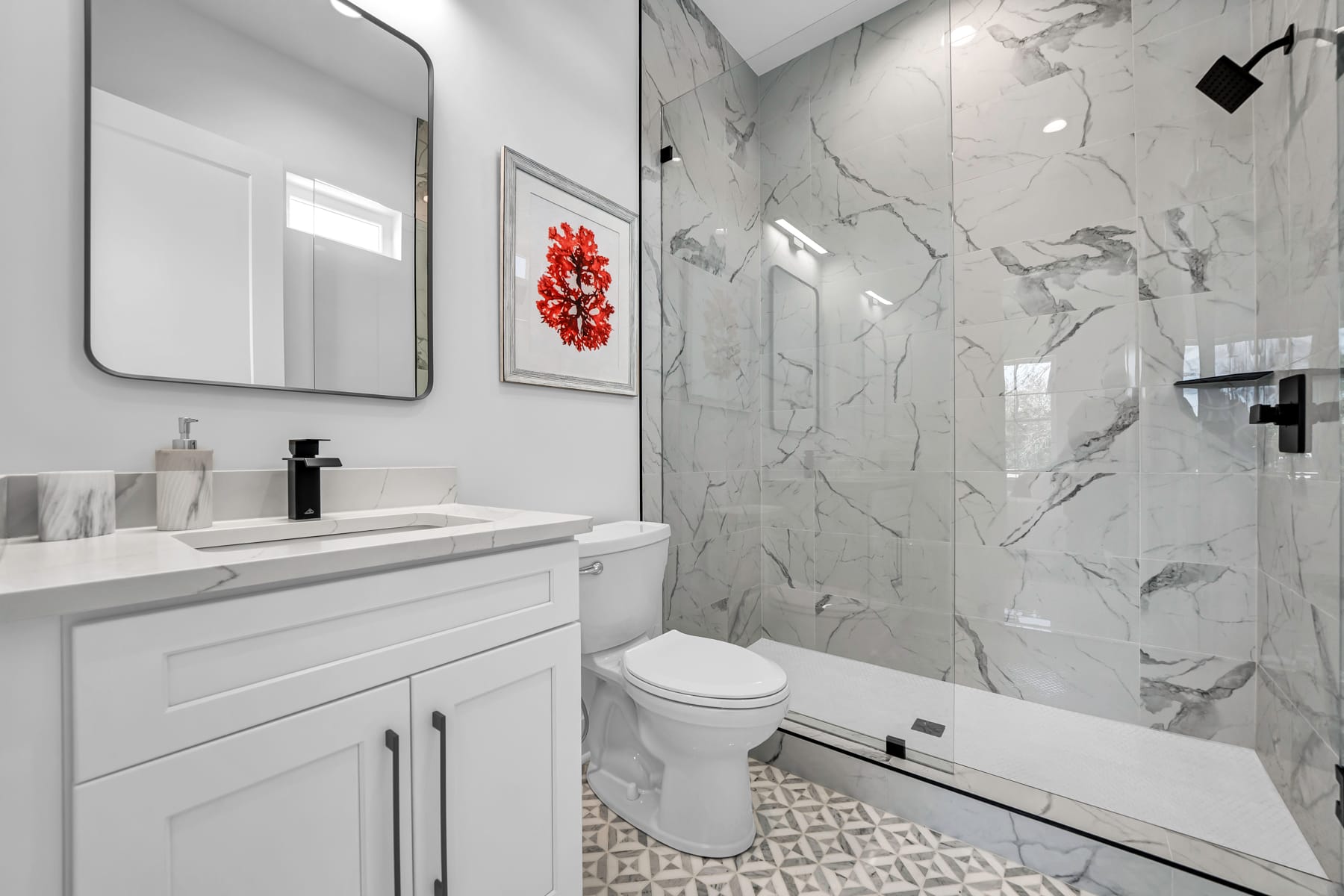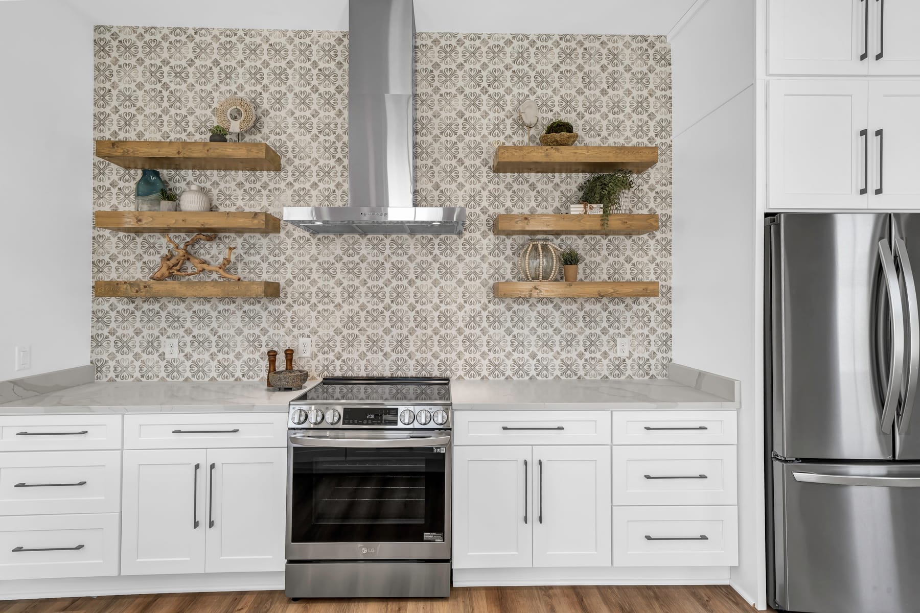 The gourmet kitchen is a chef's dream, featuring striking tile backsplashes, pristine white quartz countertops, and high-end stainless steel appliances, including dual dishwashers and an ice-maker. Every detail in this home speaks of quality and luxury.