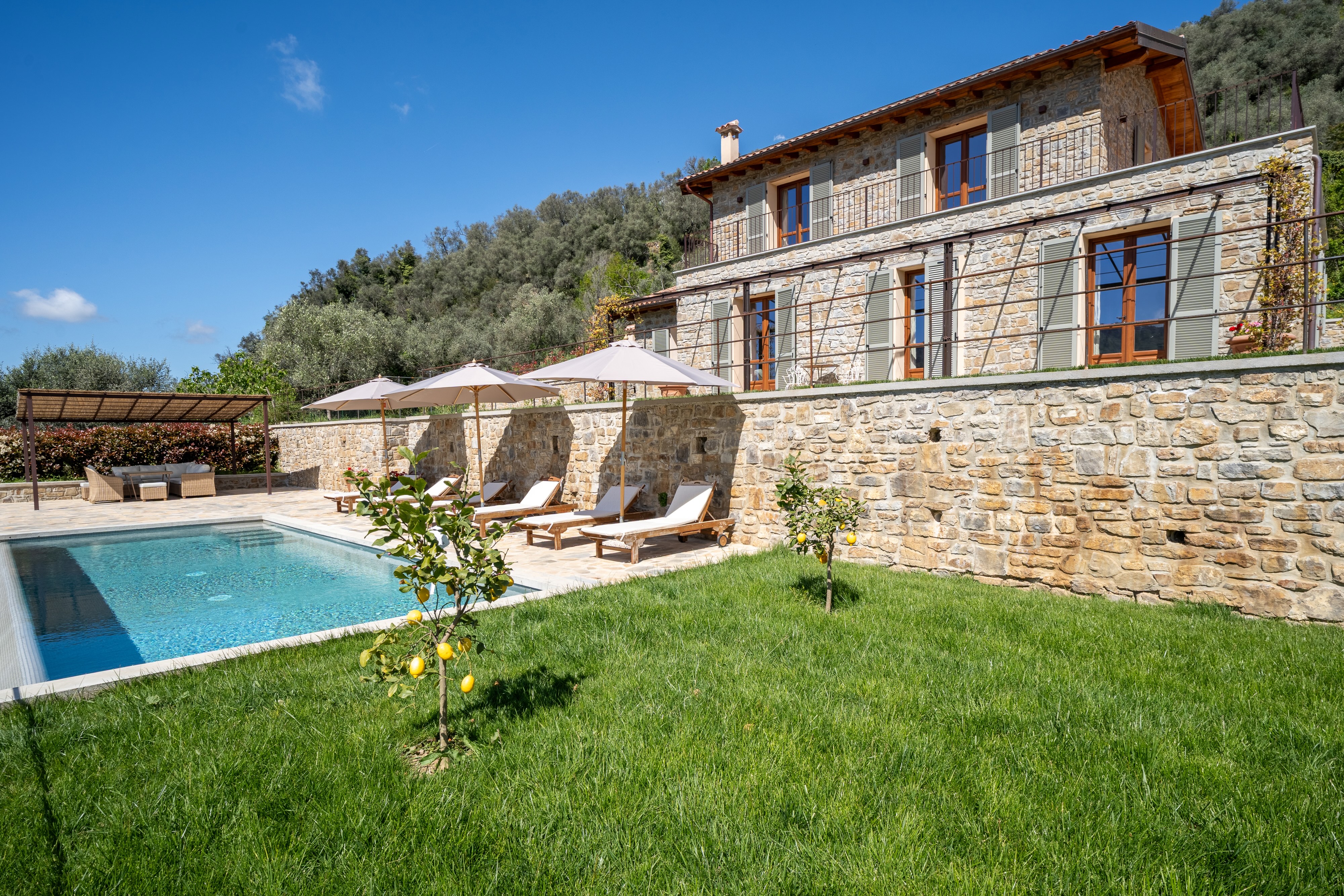 Outdoors, the villa is made for both relaxed and active living: enjoy the summer kitchen with pizza oven, sunbeds with enviable views across the lush hills, ample seating under the pergola for long warm evenings, a boule court for play, and a garden rich with citrus and olive trees — a space as beautiful as it is effortless. Just a short stroll away, the village square of Apricale awaits with year-round activity, several restaurants and bars where you’ll quickly feel part of the local scene. And when you’ve explored the surrounding hills and their network of trails, the full glamour of the Riviera is just a short ride away.