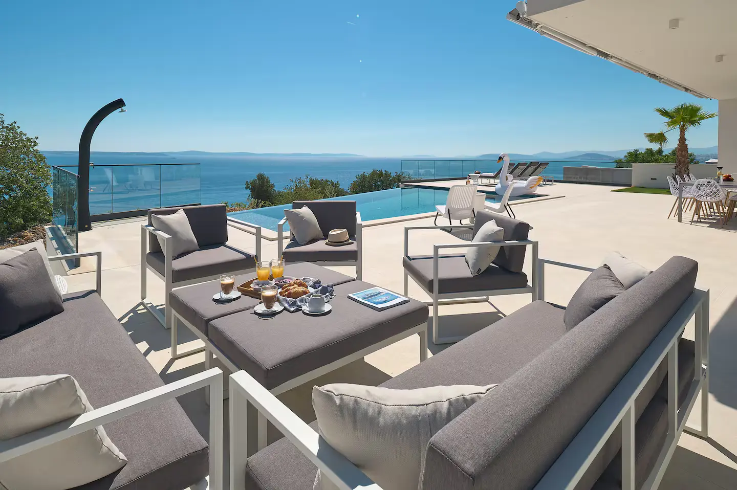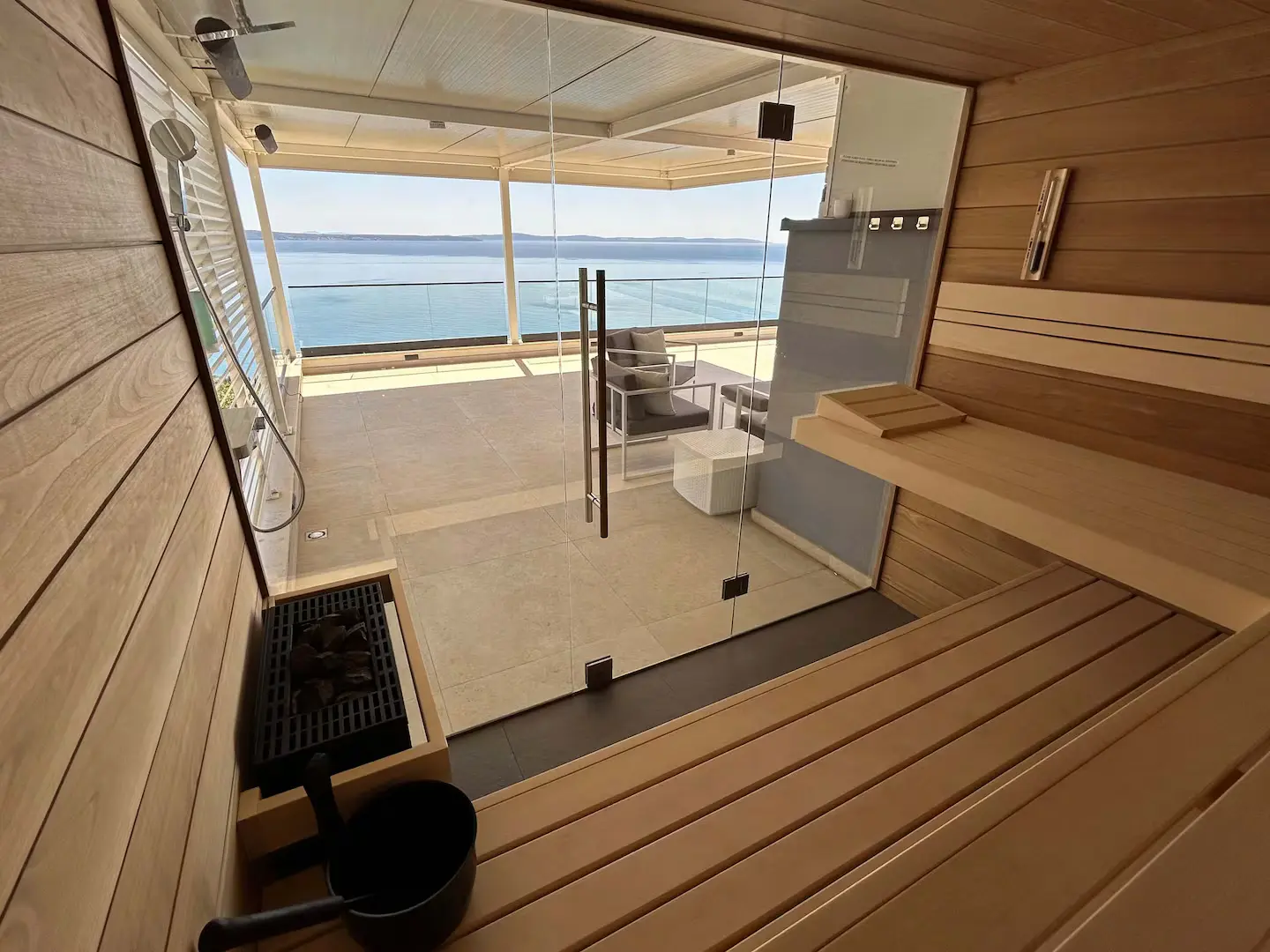 Features: 4 king-size bedrooms, 4 spa bathrooms, 230m² living space, 100m² infinity pool, sauna, jacuzzi, 360° Adriatic views.