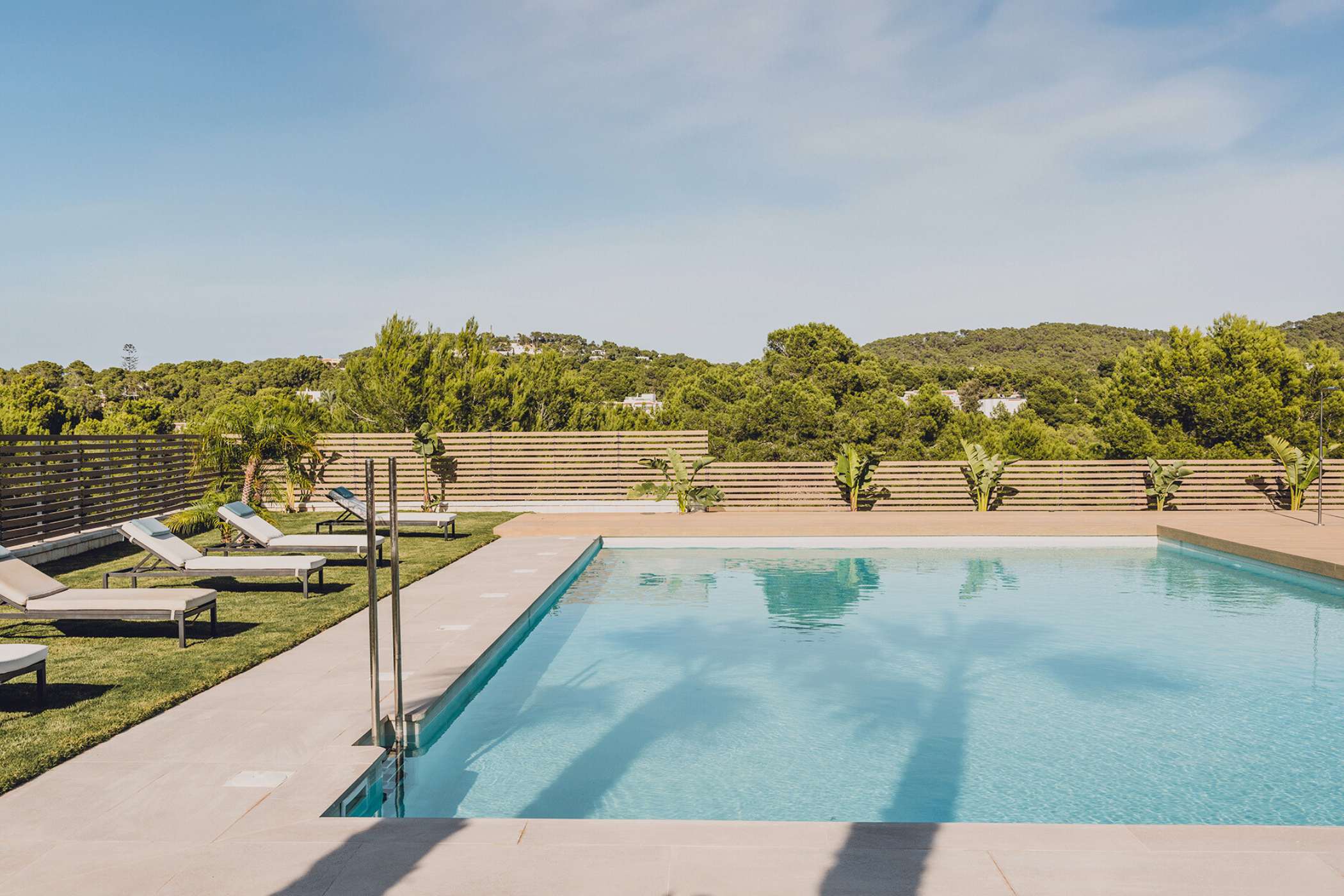Enjoy relaxing hours on your roof terrace with lounge and dining area, a hot tub and beautiful panoramic views of the sea and the green surroundings. Whether sunbathing, enjoying a sundowner or watching Ibiza's spectacular sunsets - every moment here is a special experience. A small saltwater pool and carefully designed outdoor areas complete the inside-out experience, while the private fitness and wellness area with sauna provides additional comfort.
