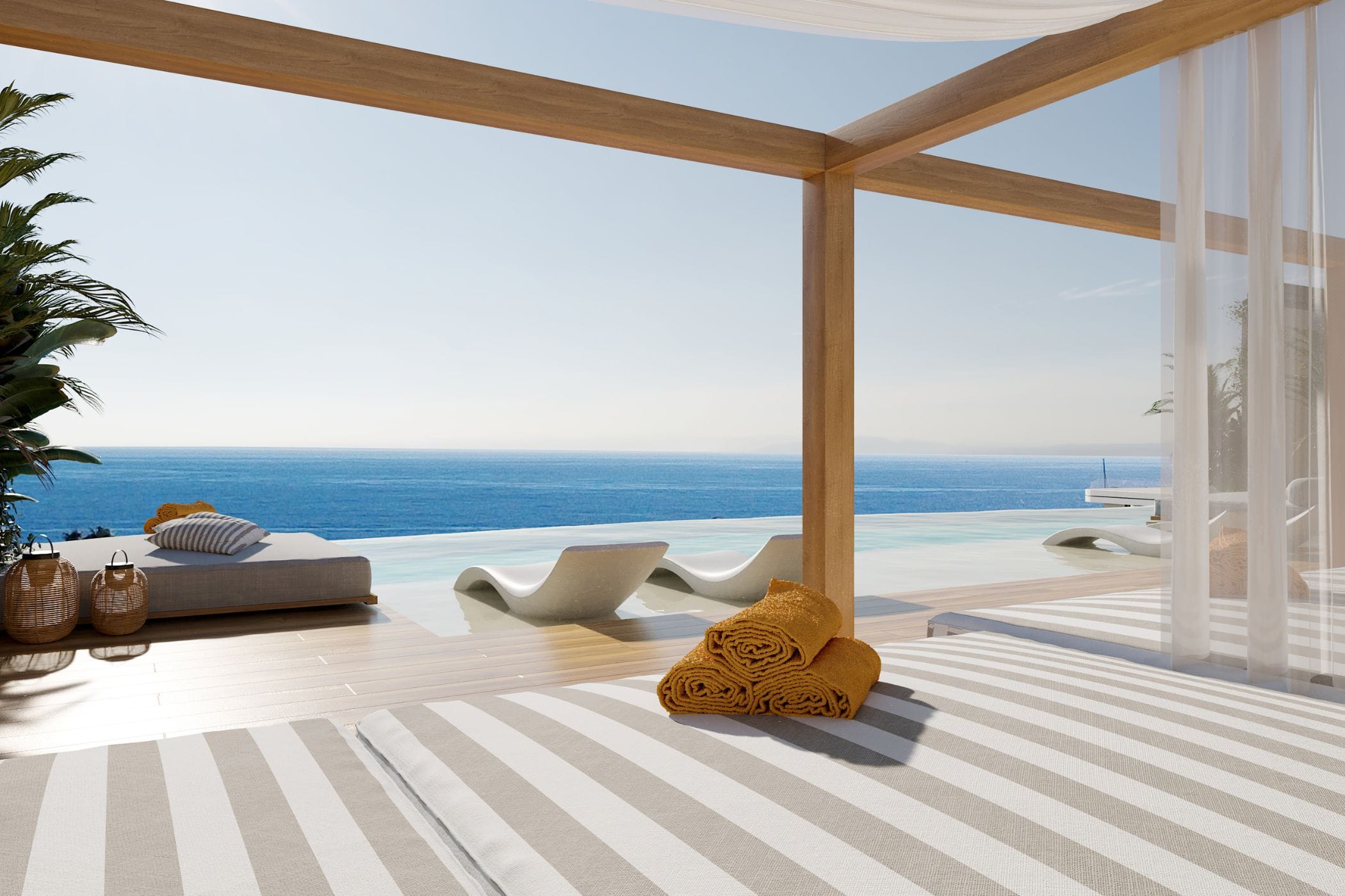 The covered south-east facing terrace with optional pool offers magnificent sea views and invites you to start the day with Mediterranean ease.